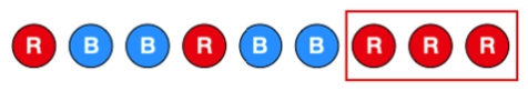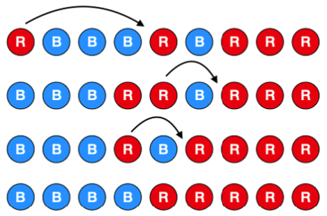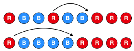 다음으로 이동 횟수에 대해 생각해 보겠습니다. 빨간색 공이 오른쪽으로 이동할 때 처음부터 빨간색이면 이동을 하지 않습니다. 그러다가 파란색 공이 나오고 부터 한 번의 횟수로 원하는 위치에 이동하게 됩니다.