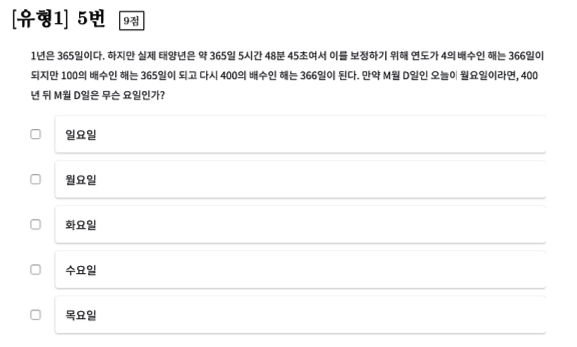 400년 뒤라면 400일이 추가 됩니다. 여기에 윤년이 더해지게 됩니다. 윤년은 4년 마다 1일씩 늘어납니다. 그리고 100의 배수는 늘어나지 않고, 400의 배수에서 다시 늘어납니다. 먼저 4년마다 늘어나는 1일은 400년동안 총 100번 있습니다. 100년 마다 윤년이 되지 않는 해가 돌아오기 때문에 4일이 빠집니다. 마지막으로 400년은 1일이 늘어나기 때문에 1일이 더해집니다. 100 - 4 + 1이 되어 97일이 됩니다. 그럼 총 늘어나는 날짜는 497일이 됩니다. 이 값을 7로 나누면 71이 되고, 나머지가 없기 때문에 요일의 변화가 없습니다. 따라서 월요일이 됩니다.