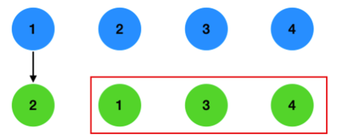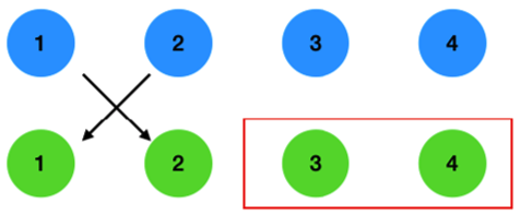 이제 1번과 2번이 선물을 서로 교환하지 않을 경우를 생각해 보겠습니다. 1번 친구가 2번 선물을 골랐다고 해서, 2번 친구가 1번 선물을 고르리라는 보장이 없기 때문 입니다.