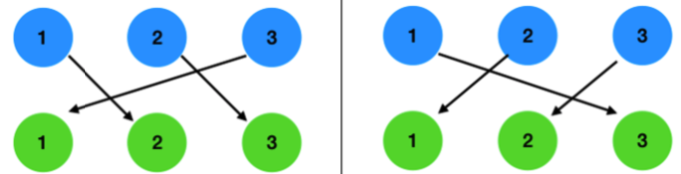 완전 순열(Complete permutation) 또는 교란(derangement) 순열이라 불리는 순열에 대해 알아보겠습니다. 교란 순열의 예를 들어 보겠습니다.