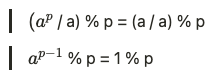 여기까지 이해되면 완료된 것입니다. 즉 위의 어떤 수 나누기 a 를 어떤 수 곱하기 $a^{p-2}$ 로 나타낼 수 있다는 뜻 입니다. 나누기가 곱하기로 바뀌었기 때문에 나머지 연산의 분배 법칙이 사용 가능하고 아래와 같은 식으로 나타낼 수 있습니다.