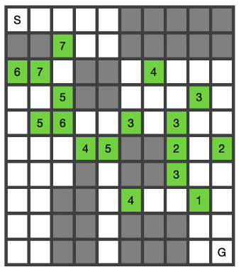 깃발의 위치인 G에 도달하기 위해서는 1번에 도달해야 합니다. 1번만이 G에 도달할 수 있기 때문 입니다. 다음으로 1번 위치에 가기 위해서 도달해야 하는 지점을 생각해 보겠습니다.