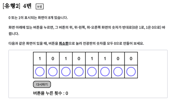버튼을 누르면 그 좌 우도 같이 숫자가 변합니다. 모두 0으로 만들기 위해서는 5번째 버튼을 눌러 6번째, 7번째 1을 0으로 바꾸고, 4번째 0은 1로 바뀌게 해야 합니다.