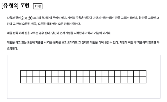 제일 왼쪽 아래 칸인 빨간색 칸을 고르면 지기 때문에 죽어 있는 칸을 위와 같이 파란색으로 만들어야 합니다. 그리고 상대방이 1번칸을 선택하면 나는 2번칸을 선택하고, 상대방이 2번칸을 선택하면 나는 1번칸을 선택하여 상대방이 결국 빨간칸을 선택하도록 만드는 것이 핵심 입니다.