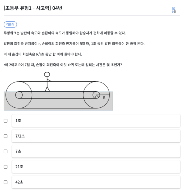 간단한 수학 문제 입니다. 발판이 1초동안 1바퀴 돌 때 손잡이 회전축은 얼마나 도는지 계산하는 문제 입니다. r은 2이고, R은 7이기 때문에 7/2로 3.5초동안 한 바퀴 돌게 됩니다. 총 여섯 바퀴를 돌아야 하기 때문에 3.5 * 6으로 총 21초가 걸리게 됩니다.
