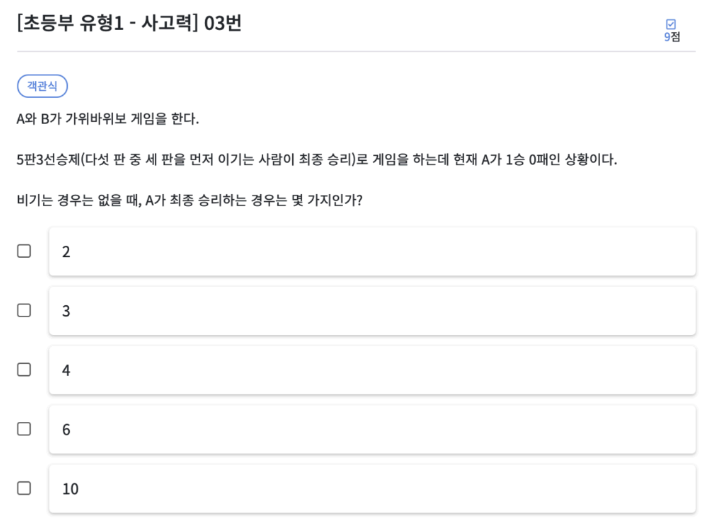 이기는 경우를 따져보면 쉽게 알 수 있는 문제 입니다. 왼쪽은 이기는 경우, 오른쪽은 지는 경우를 뜻합니다. 이렇게 나타냈을 때 승, 패 정보를 파악해보면 A가 이기는 경우가 몇 가지인지 알 수 있습니다. 경우의 수를 따져보면 아래와 같이 6가지임을 알 수 있습니다.