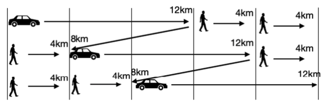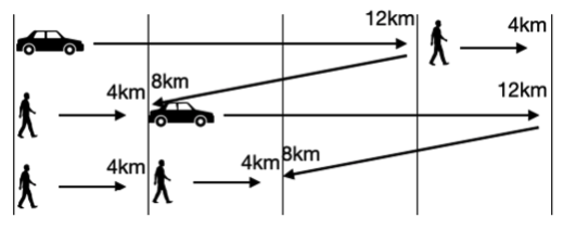 첫 번째 그룹 4명을 태우고 12킬로미터를 갑니다. 내려주고 8킬로미터를 다시 돌아갑니다. 그럼 자동차는 1시간이 걸리고 총 20킬로미터를 이동한 것이 됩니다. 여행객의 속도는 4킬로미터 이므로 정확히 두 번째 그룹을 만나게 됩니다.