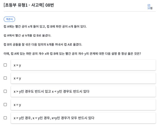 수학적으로 따져봐도 B에서 A로 k개 옮길 때 B컵에 남은 빨강 공의 개수만큼 A컵에 파란색으로 옮겨진다는 것을 생각하면 쉽게 x와 y가 같다는 것을 알 수 있습니다.