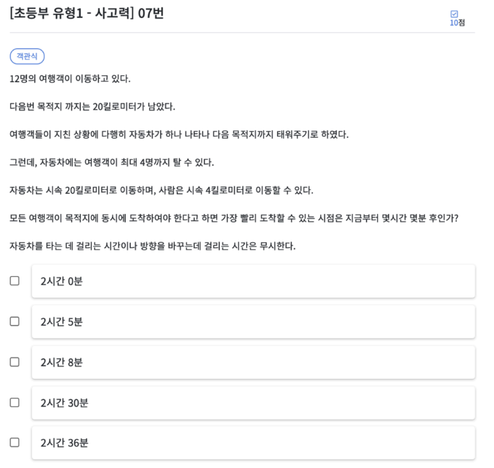 마지막 그룹을 계산해보면 걸어서 8킬로미터이기 때문에 2시간이 걸립니다. 그리고 12킬로미터를 자동차로 이동하기 때문에 12/20 * 60으로 36분이 걸립니다.