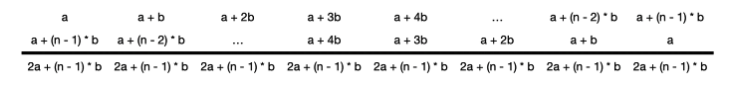 이제 a, b, n의 값을 이해했으니 그 값을 표현해 보겠습니다. a부터 b의 공차를 가지고 있는 등차수열 n개를 적고, 그 밑에는 마지막 항부터 첫째 항까지 거꾸로 적어 더해주겠습니다.