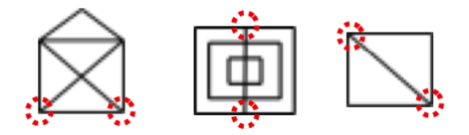 첫 번째, 두 번째, 세 번째의 경우 교차되는 홀수 쪽지점이 2개 입니다. 따라서 한 붓 그리기가 가능 합니다. 홀수점에서 시작하면 다른 홀수점에서 한 붓 그리기를 할 수 있습니다.