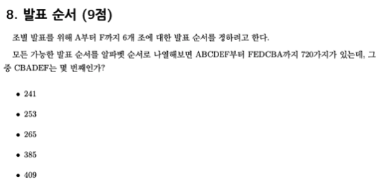 맨 앞의 알파벳 A에서 B로 바뀔 때까지를 생각해 보겠습니다. B부터 F까지 5개의 숫자의 숫자의 경우의 수는 5!이 됩니다. 5 * 4 * 3 * 2 * 1로 120가지 경우가 있습니다.