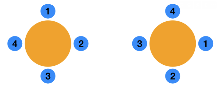 그럼 먼저 원순열이 무엇인지부터 알아보겠습니다. 원탁이 있고 1번부터 4번까지 자리에 앉는다고 하겠습니다. 이 때 앉을 수 있는 경우의 수를 구하는 것입니다. 원탁에 1, 2, 3, 4순서로 앉아 있는 것과 4, 1, 2, 3순서로 앉아 있는 것은 같은 순서로 앉아 있는 것으로 보는 것 입니다.