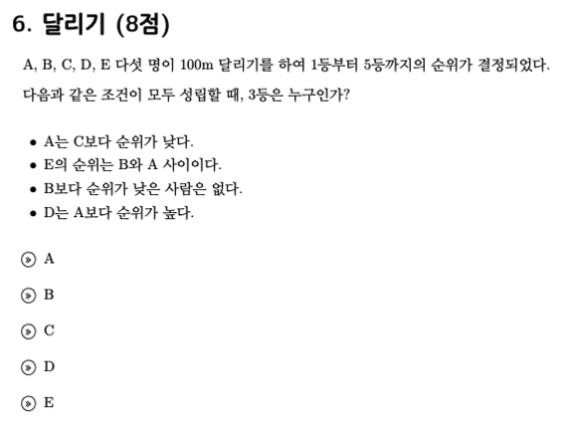 마지막으로 D는 A보다 순위가 높습니다. 단 D와 C중 누가 더 높은지는 알 수 없습니다.
