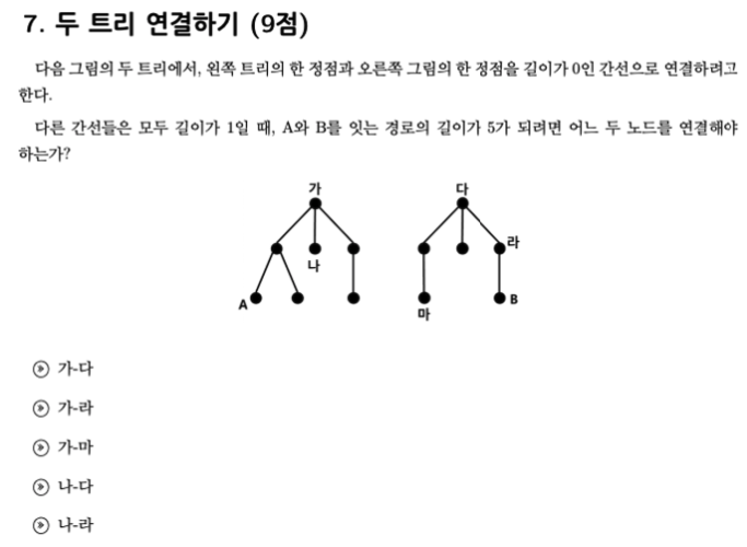 두 정점을 연결해서 거리가 5가 되는 경우는 나 : 3, 다 : 2를 연결했을 때 거리가 5가 됩니다. 따라서 정답은 4번 나 - 다 가 됩니다.