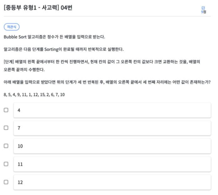 버블 정렬이 어떻게 동작하는지 알고 있다면 계산하지 않아도 세 번째 반복 후 어떤 숫자가 오른쪽 세번째에 오는지 알 수 있습니다. 지금은 버블 정렬에 대해 모른다고 가정하고 문제를 풀어보겠습니다.