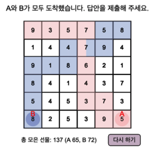 최대한 큰 수를 선택하면서 A는 오른쪽 아래로, B는 왼쪽 아래로 이동해 나갑니다. 겹치는 부분이 하나만 가능하기 때문에 조절해 나갑니다.
