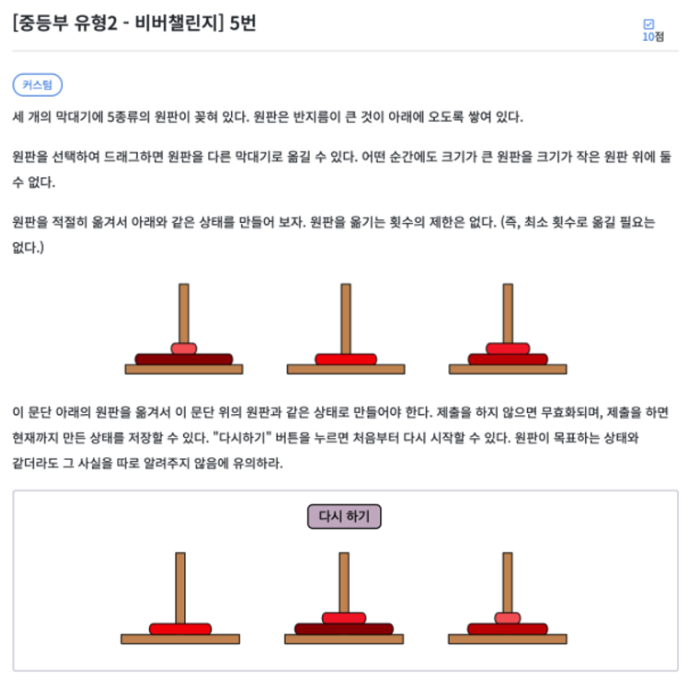 하노이의 탑을 이해하면 쉽게 해결할 수 있습니다. 원판을 옮기는 횟수에 제한이 없기 때문에 먼저 어떤 원판을 어디로 옮길지 정한 뒤 차근차근 진행하면 해결 가능합니다. 하노이의 탑 이동에 대해 잘 모르겠다면 아래 링크를 통해 이동 방법을 확인 바랍니다.