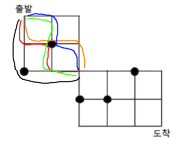 왼쪽 상단에 두 점 모두 지나는 방법은 없습니다. 한 점을 지나는 경로를 모두 찾습니다. 모두 찾아보면 총 5개의 경로를 찾을 수 있습니다.