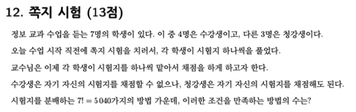이제 청강생 2명이 자신의 시험지를 채점한다고 생각해 보겠습니다. 수강생 4명, 청강생 1명이 자신의 시험지를 채점하지 않으면 됩니다.