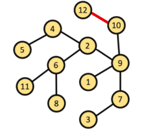 2 - 6 으로 연결된 간선은 2번째에 위치하긴 했지만 경우가 다르기 때문에 따로 계산하겠습니다. 10 - 9로 연결된 간선을 계산해보고 경우가 3가지가 있으니 3배를 하면 됩니다. 총 220개의 경우에서 10, 12번을 제외한 10개의 정점에서 3개의 정점을 고르는 경우를 계산하면 됩니다. 계산해보면 총 120가지가 나오고 220 - 120을 하면 100번 사용된다는 것을 알 수 있습니다. 총 3가지 경우이기 때문에 300번이 됩니다.