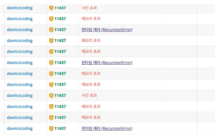 문제를 보니 메모리 초과, RecursionError가 계속 나왔습니다. 어디가 맞았던 풀이인지 몰라 정확한 원인은 찾지 못했습니다.