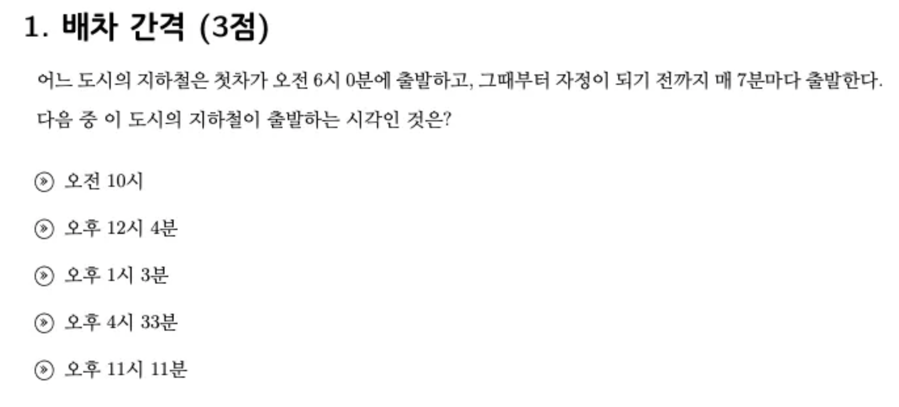 1번 오전 10시는 오전 6시부터 4시간 뒤이기 때문에 240분 입니다. 240은 7의 배수가 아니기 때문에 답이 아닙니다.