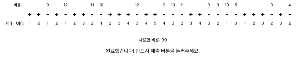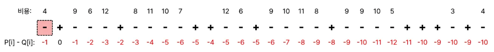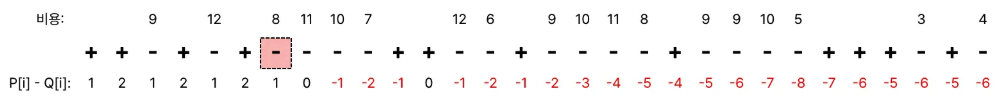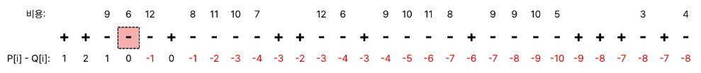 P[i] - Q[i] 값이 이미 아래 적혀 있습니다. 비용의 합이 최소가 되게 하려면 비용이 작은 것들을 골라야 합니다. 그냥 고르는 것이 아니라 앞에서부터 P[i] - Q[i] 값이 음수가 되는 위치보다 앞에 있는 비용 중 가장 작은 것을 고르면 최소 비용으로 정답을 찾을 수 있습니다.