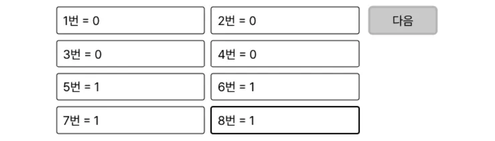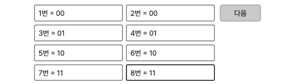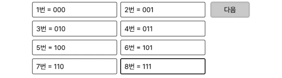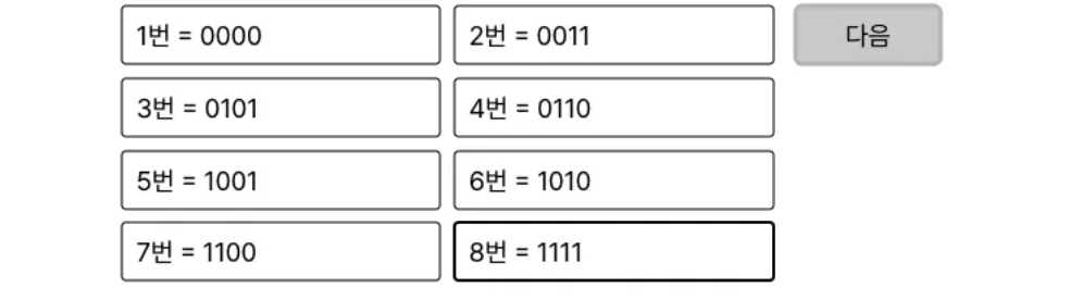 어느 글자를 가리더라도 각각의 번호가 유일할 수 있도록 해야 합니다. 각각을 숫자로 생각하지 않고 구별하기 위한 기호라 생각하고 번호를 만들어 줍니다. 첫 번째로 1번부터 8번까지 00001111 을 입력 합니다.