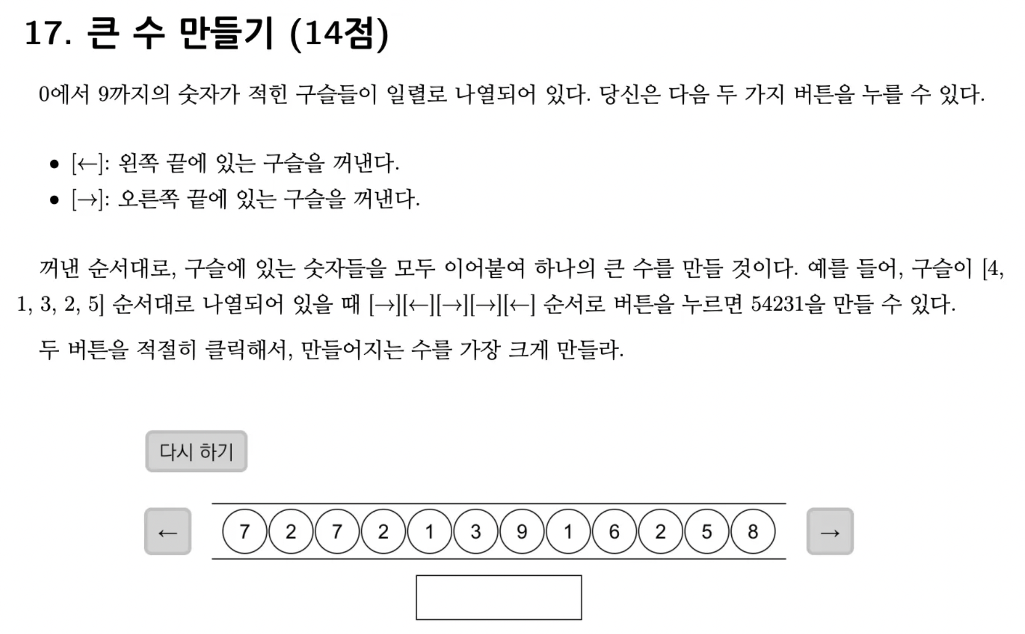 양쪽 끝의 숫자를 확인해서 더 큰 숫자를 클릭해서 빼주면 됩니다. 만약 두 수가 같다면 다음 숫자들이 큰 숫자를 먼저 빼면 됩니다.