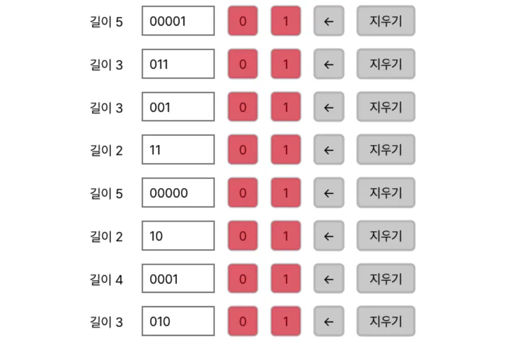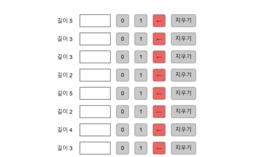 혼란스럽지 않게 규칙적으로 진행해야 합니다. 길이 2에서는 1로 시작하는 두 가지 경우로 만들었습니다. 길이 3에서는 0으로 시작하게 하여 겹치지 않게 하였습니다. 같은 방식으로 숫자가 겹치지 않게 만들다보면 아래와 같이 만들 수 있습니다. 정답이 여러가지이기 때문에 꼭 아래와 같은 방법이 아니어도 정답이 됩니다.