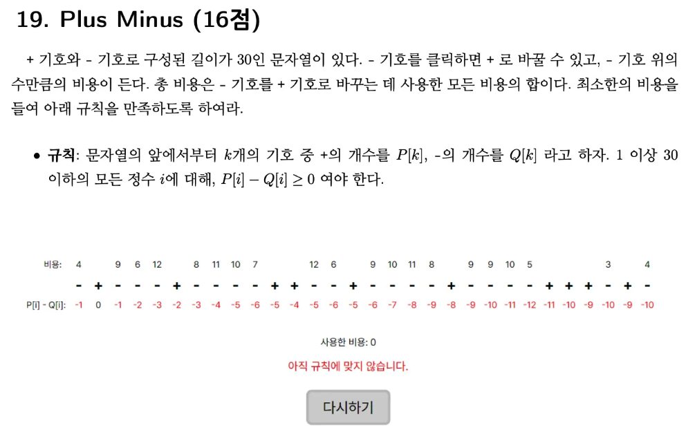 이 문제는 1부터 30까지 + 의 개수를 - 의 개수보다 많게 만드는 것입니다. 이 때 각 - 를 + 로 바꿀 때 비용이 들고, 그 비용이 최소가 되도록 해야 합니다.