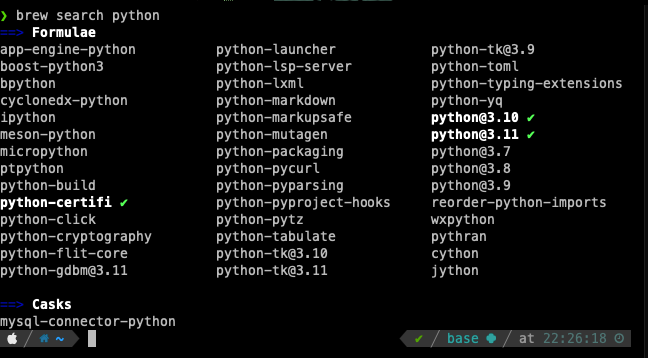 그럼 다음과 같이 python이라는 이름이 붙은 설치 가능한 프로그램 목록이 나옵니다. 여기서 Formulae 와 Casks가 나오는데 둘의 차이는 설치할 프로그램의 형식이라고 합니다. 정확한 차이점은 Homebrew 홈페이지에 다음과 같이 나와 있습니다.