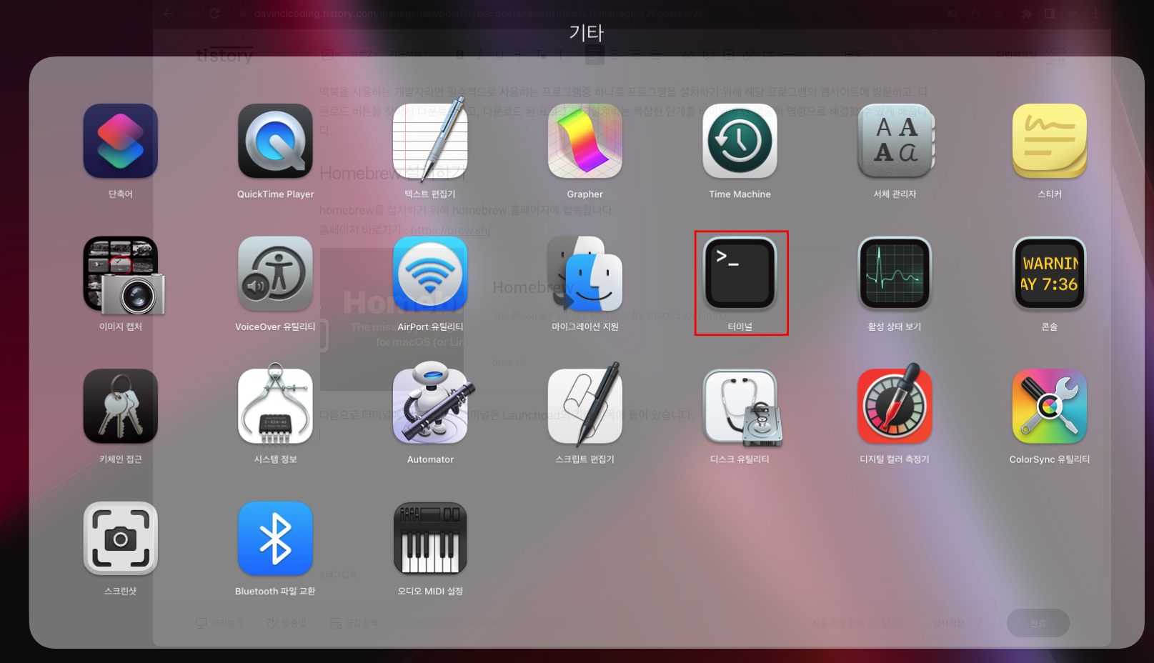 오른쪽 메모지 형태의 아이콘을 누르면 쉽게 복사가 가능합니다. 다음으로 터미널에 접속합니다. 터미널은 Launchpad의 기타 항목에 들어 있습니다.