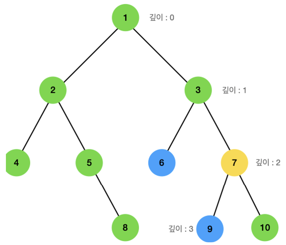 3의 부모는 1이고 7의 부모는 3 입니다. 아직 공통 조상이 없기 때문에 계속 위를 찾게 됩니다. 최소 공통 조상이 3이지만 그냥 위로 타고 올라가기만 한다면 최소 공통 조상을 지나치게 될 수 있습니다. 이는 정점들의 깊이를 고려하지 않았기 때문입니다. 두 정점이 같은 높이에서 한 칸씩 위로 올라가야 공통 조상을 찾을 수 있습니다.
