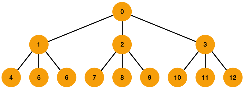 노드의 개수는 깊이가 더해질 때마다 K배 늘어 납니다. 위 그림처럼 K가 3인 경우를 생각해 보면 각 깊이의 시작값을 계산할 수 있습니다. 루트를 0이라고 하면 1번째 깊이는 1이 시작이 되고, 두 번째 깊이는 3을 더한 4가 시작이 됩니다. 3번째 깊이는 4에다가 9를 더한 13이 됩니다. 즉 i 번째 깊이의 시작은 K ** i 값이 됩니다. 즉 노드의 깊이는 K ** i를 더해주면서 깊이를 찾다가 노드 값이 넘어가는 순간이 깊이가 되는 것입니다. 이것은 세그먼트 트리에서 트리의 깊이를 구하는 방법과 유사하기 때문에 쉽게 이해가 될 것으로 생각됩니다.