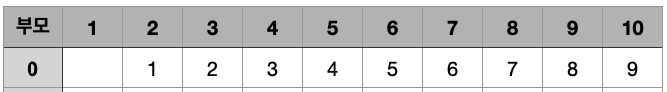 루트 1부터 시작하여 10번까지 1열로 늘어서 있는 트리가 있습니다. 그림의 자리 차지를 줄이기 위해서 위와 같이 표시 하였습니다. 먼저 기존의 부모 배열을 만들어 보겠습니다. 부모의 초기 세팅으로 생각하면 됩니다.