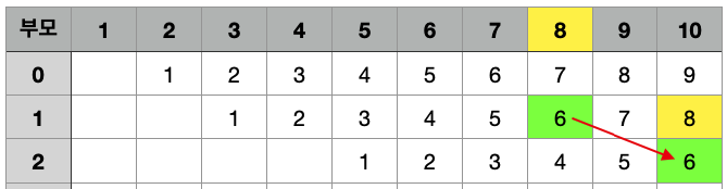 같은 방식으로 8 차이 나는 부모는 4차이 나는 부모의 4 차이 나는 부모가 됩니다. 10의 4 차이 나는 부모인 6의 4 차이나는 부모인 2를 찾아주면 됩니다.