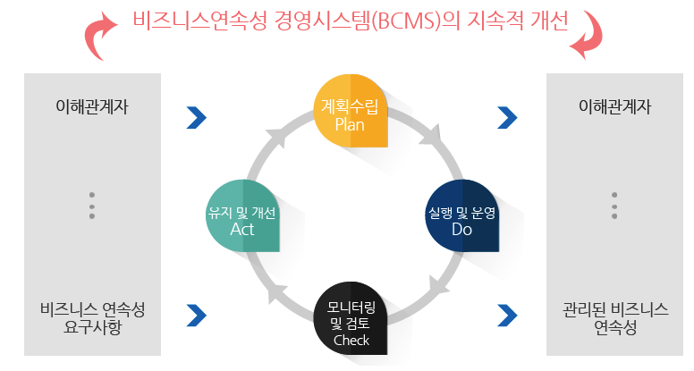 기업의 비즈니스 연속성을 위해 BCP1 수립에서 도입, 운영, 검토까지 지속적인 개선에 대한 요구사항을 규정한 BCMS2의 국제 표준 입니다. 기업의 BCM 역량에 대한 평가 지표로 영국 표준인 BS 25999를 기반으로 만들어졌습니다.