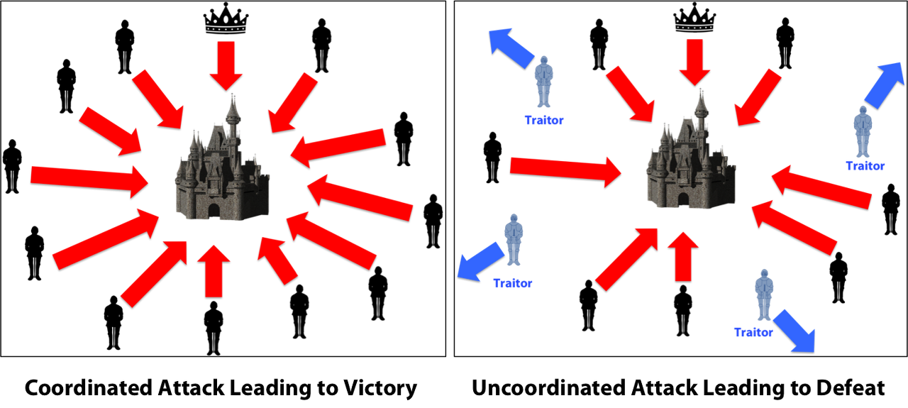 비잔틴 장군 문제는 위와 같이 성을 공략하는 방법에 대한 딜레마 입니다. 적의 성에는 적군이 많이 있기 때문에 한 번에 모두 공격을 해야만 성을 함락할 수 있습니다. 지휘관이 내일 10시에 일제히 성을 공격하자고 각 장군들에게 전령을 보내 공격을 진행 합니다. 이 때 장군들 사이 혹은 소식을 전하는 전령들 중에 첩자가 존재해 10시가 아닌 8시에 공격하자고 전달합니다. 이렇게 되면 어떤 장군은 제대로 전달 받아 10시에 공격하고, 어떤 장군은 첩자에게 속아 8시에 공격하게 됩니다. 이렇게 전력이 분산되어 결국 성을 함락하지 못하게 됩니다.