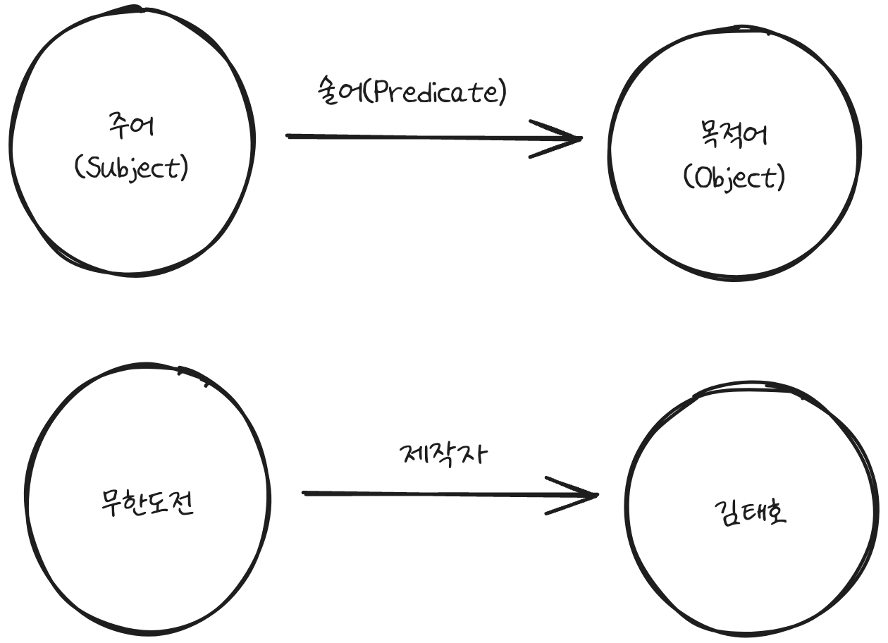 RDF는 Resource Description Framework의 약자로 LOD 데이터를 표현하기 위한 기본적인 구문 약속입니다. 기계가 이해할 수 있도록 SPO 구조로 구성되어 있습니다. SPO는 주어(Subject), 술어(Predicate), 목적어(Object)로 구성되어 있습니다. 쉬운 예로 아래와 같은 관계를 가지고 있다고 생각하면 됩니다.