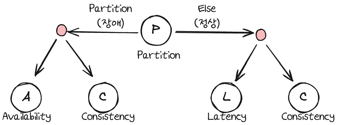 PAC는 이렇게 네트워크가 분할된 상황을 생각하는 것입니다. 하지만 이렇게 분할된 상황은 그렇게 많지 않습니다. 분할된 상황보다 정상적으로 동작하는 상황이 훨씬 많습니다. 그래서 이렇게 정상적인 상황에서 어떤 것에 더 중점을 두느냐가 ELC 입니다. E는 Else의 약자로 분할 상황이 아닌(Else) 정상 상황을 뜻합니다. 이 때 시간 지연(Latency)을 먼저 고려할지, 일관성(Consistency)을 먼저 고려할지를 선택하는 것입니다.