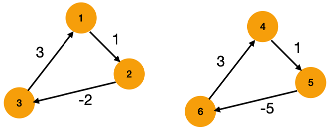 왼쪽 사이클 1 -> 2 -> 3의 경우 음수가 있기는 하지만 한 바퀴를 돌고 나면 거리가 3 + 1 + (-2) 로 2가 됩니다. 2바퀴를 돌고 나면 거리가 4가 됩니다. 반면에 오른쪽 사이클인 4 -> 5 -> 6 도 음수가 있습니다. 한 바퀴를 돌고나면 3 + 1 + (-5)로 -1이 됩니다. 2바퀴를 돌고나면 거리가 -2가 되고 여러바퀴를 돌면 돌수록 거리가 줄어들게 됩니다. 이런 식으로 음수로 계속 줄어드는 사이클을 음의 사이클이라고 합니다.