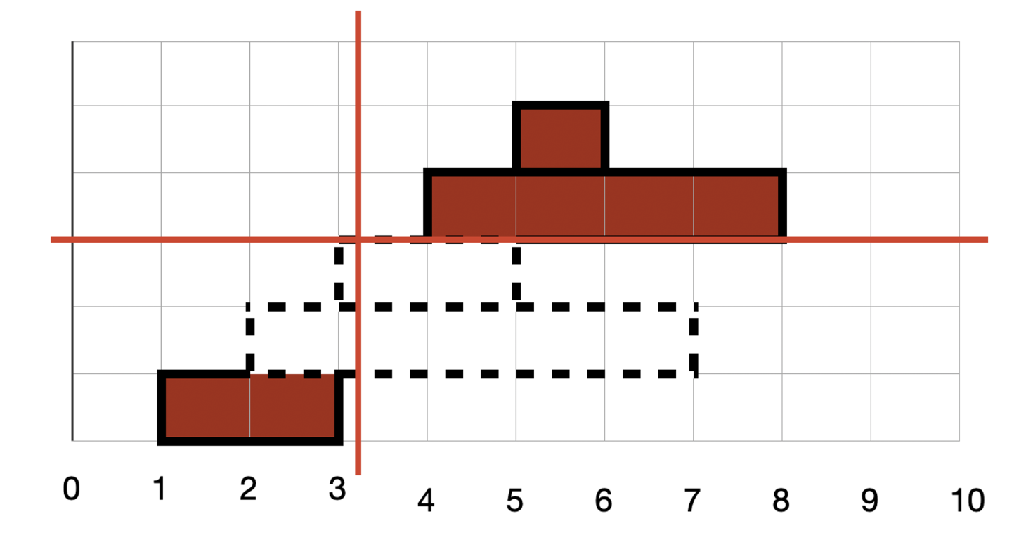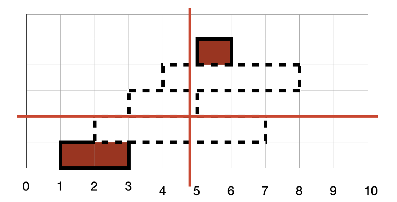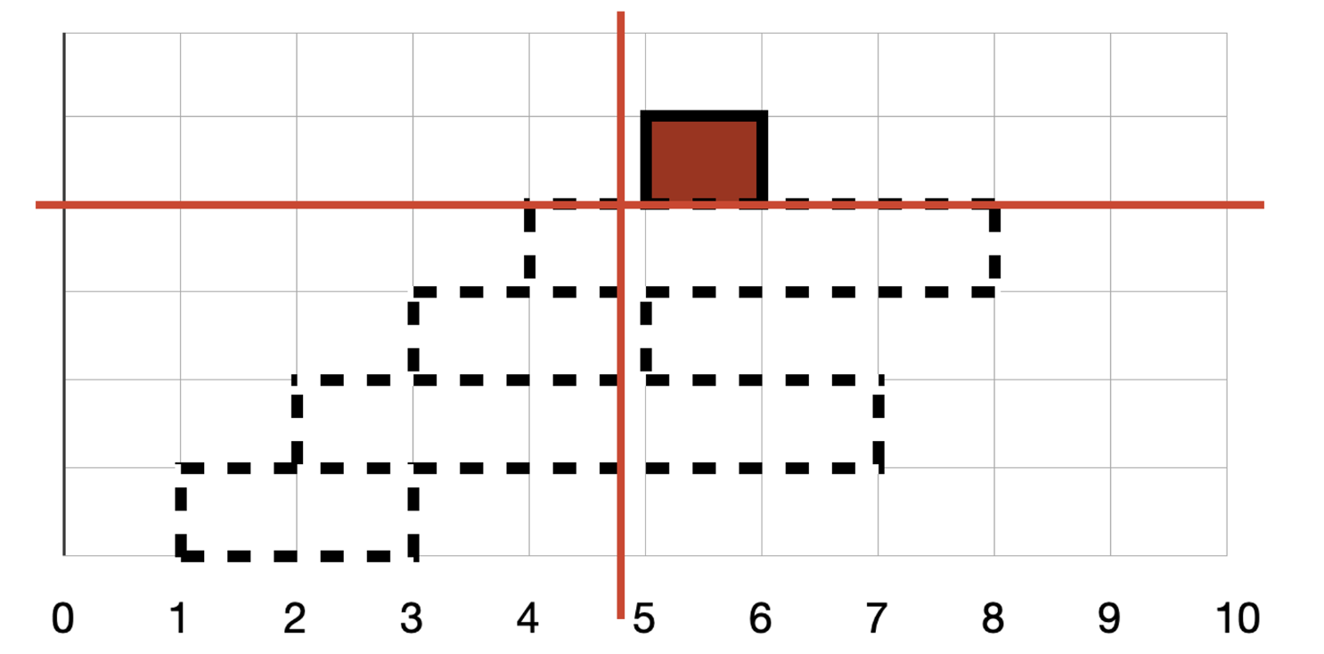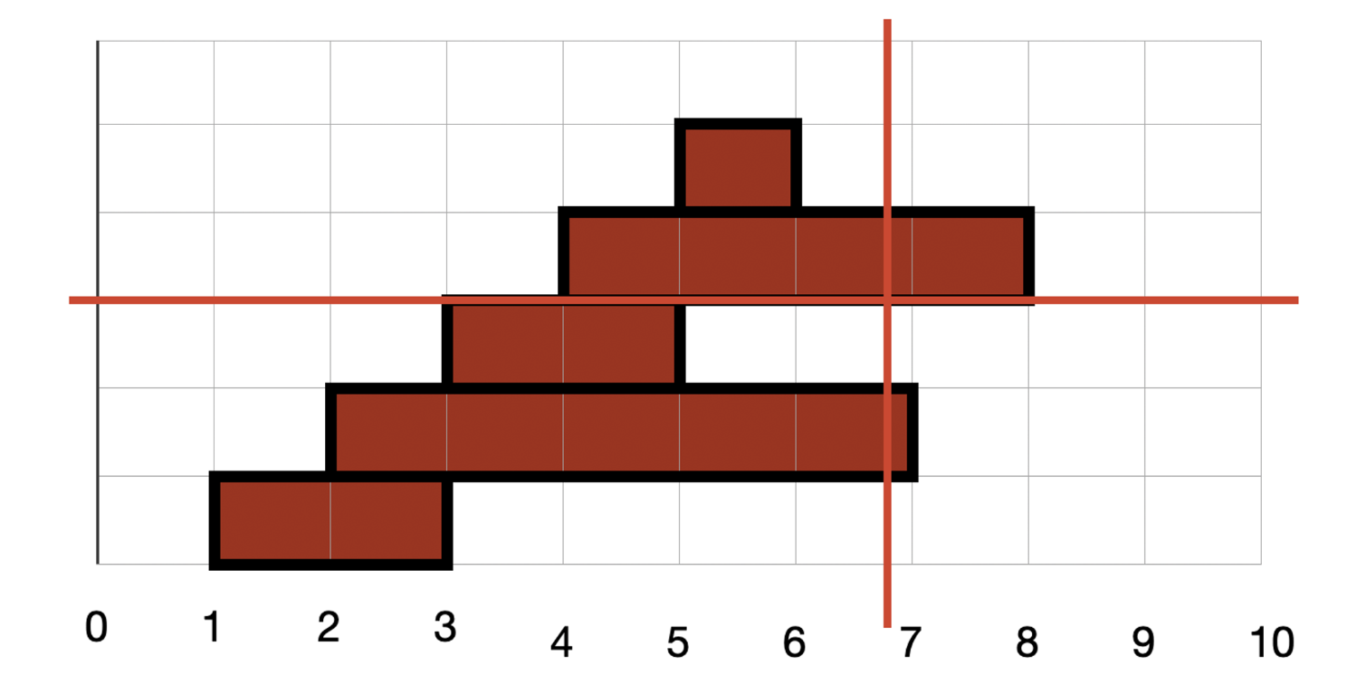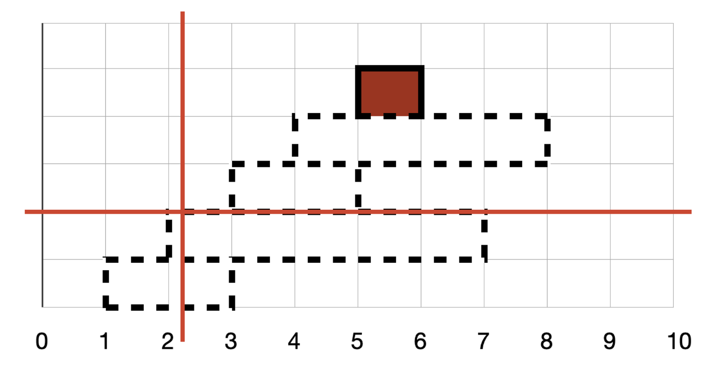 모든 고기들을 탐색 하면서 꼬치에 꽂히는 고기를 찾습니다. x 꼬치는 시작 s가 x보다 작은 모든 꼬치에 꽂힙니다. 이 때 x가 3이라면 3이 포함된 꼬치도 꽂히기 때문에 s ≤ x 가 됩니다. 다음으로 끝 위치는 3이 포함되지 않기 때문에 x < e가 됩니다. y값 역시 똑같은 방법으로 꼬치에 꽂힌 항목을 찾습니다.
