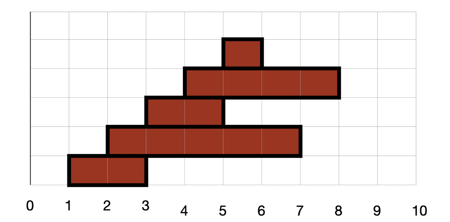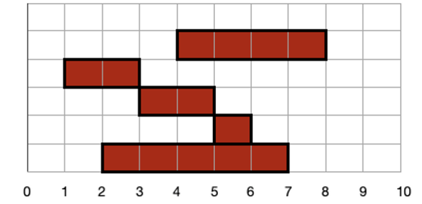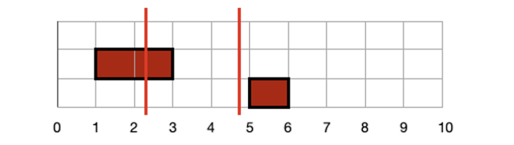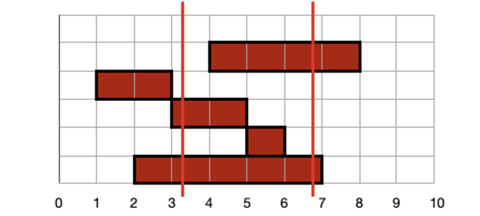 시작이 3보다 작은 고기는 총 3개가 있고, 첫 번째 고기는 6보다 작기 때문에 선택되지 않습니다. 두 번째 고기는 끝 위치가 6보다 크기 때문에 선택 됩니다. 세 번째 고기도 6보다 작기 때문에 선택되지 않습니다.