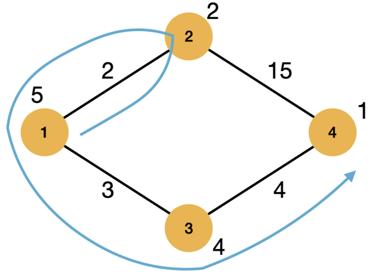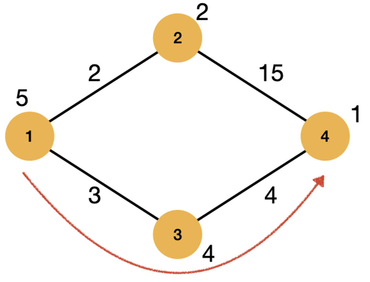 1에서 4까지 이동할 때 위 그림처럼 이동한다면 5 * 3 + 4 * 4로 31이라는 비용이 듭니다. 이것보다 더 비용을 절약하는 방법은 아래 그림처럼 이동하는 것입니다.