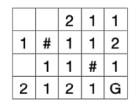 바로 2의 위치는 무조건 피해야 하는 자리 입니다. 2의 위치에서는 갈 수 있는 곳이 한 군데이기 때문에 무조건 1로 갈 수밖에 없고, 1로 가게되면 선공이 다음 턴에 G에 도달하여 승리하게 됩니다. 그럼 빨간색 표시된 자리는 왜 안될까요? 빨간색 표시된 자리 역시 1로 갈 수 있어서 가면 안될것 같습니다. 하지만 빨간색 자리에 있다면 1이 있는 곳이 아닌 다른 곳으로 가서 선공의 승리를 가져가지 못하게 할 수 있습니다. 따라서 2번 위치만 가능합니다.