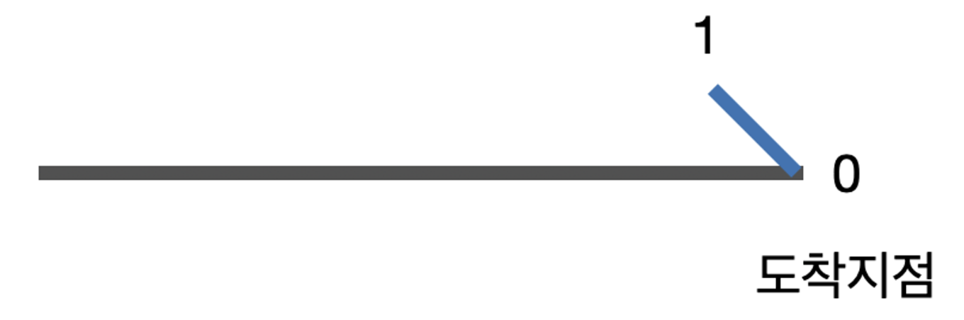 마찬가지로 마지막에서 두 번째 지점은 속력이 2 이상이 될 수 없습니다. 그래야 마지막 지점에서 속력이 1이 될 수 있고, 도착지점에서는 0이 될 수 있기 때문 입니다.
