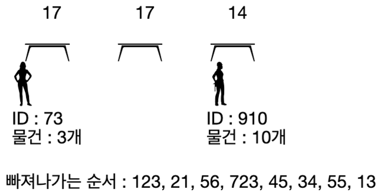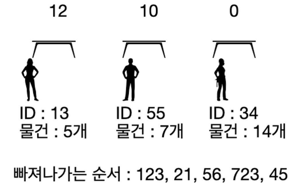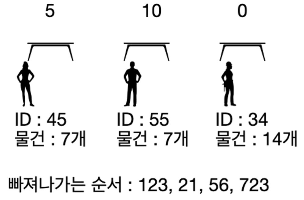 5개의 물건을 가진 723번이 빠져 나갑니다. 다음으로 물건 7개를 가진 45번이 빠져 나갑니다.