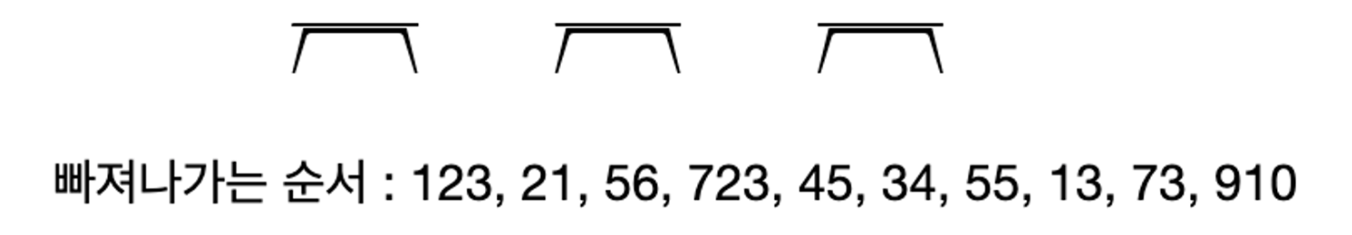 물건 4개를 가진 123번의 계산이 가장 먼저 끝납니다. 4분에 123번이 빠져나가고 다음 순서인 56번이 들어오게 됩니다.